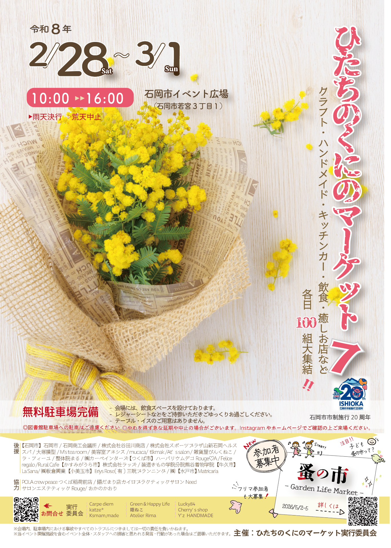 そんな石岡の地で日々研鑽するもの作り作家や 食を楽しむ方々が一同に集まり、日頃の腕を魅せる場にするだけではなく多くの方々との交流の場とさせて頂くために「ひたちのくにのマーケット実行委員会」を立ち上げました。石岡市でのマルシェを拠点として茨城県内の地で皆様とのご縁繋ぎをさせて頂けたら幸いです。